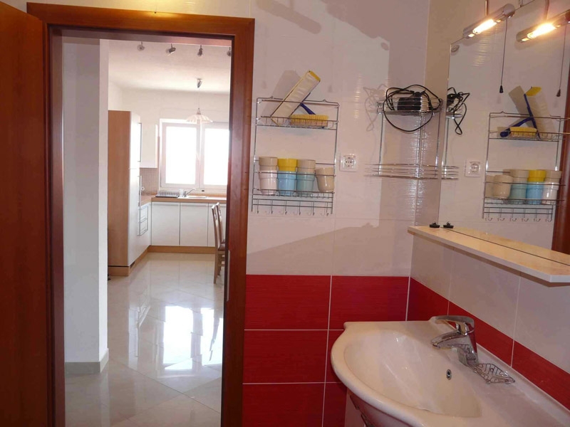 A tágas fürdőszoba "családi" sarok fürdőkáddal van ellátva. A bojler az ajtónál lévő külön kapcsolóval működik.