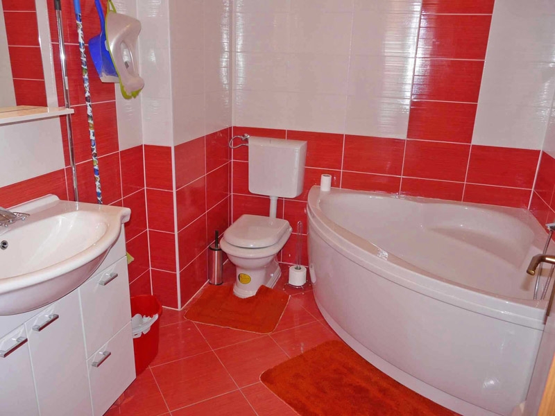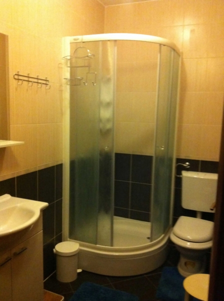 A tágas fürdőszoba "családi" sarok fürdőkáddal van ellátva. A bojler az ajtónál lévő külön kapcsolóval működik.