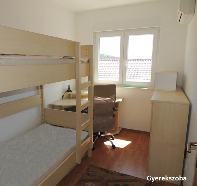 Az erkélyre nyíló hálószoba franciaágyas (ebből nyilik a zuhanyzós kisebb fürdőszoba), a másik szobában két dívány, a legkisebb szobában pedig felnőtt méretű emeletes ágy található.